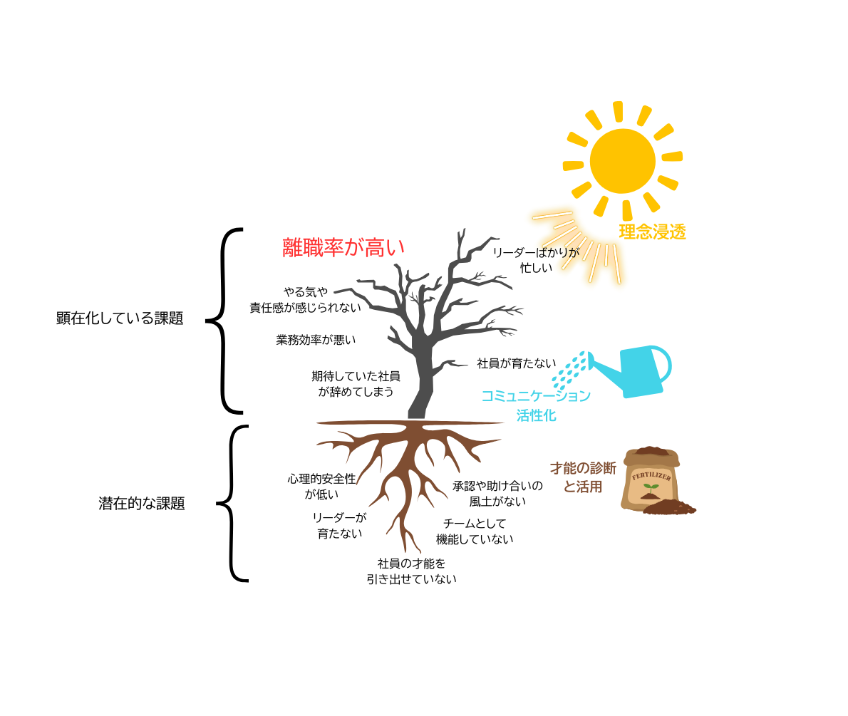 私たちは、組織に表面化している課題の本質は、左の図の木に例えると、表に見えにくい土壌の部分にあると考えています。